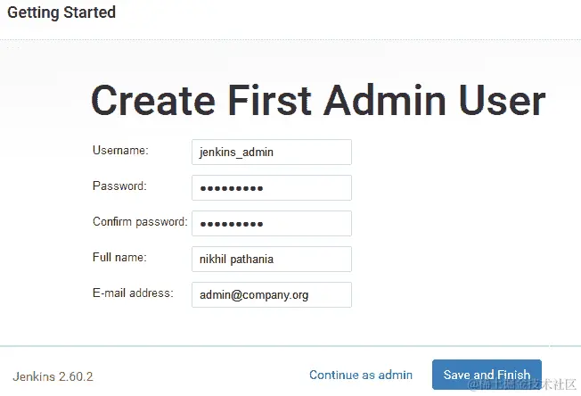 适当填写字段并点击“保存并完成”按钮。或者,您也可以选择忽略创建新的管理员用户,继续使用初始管理员用户,点击“继续作为管理员”。