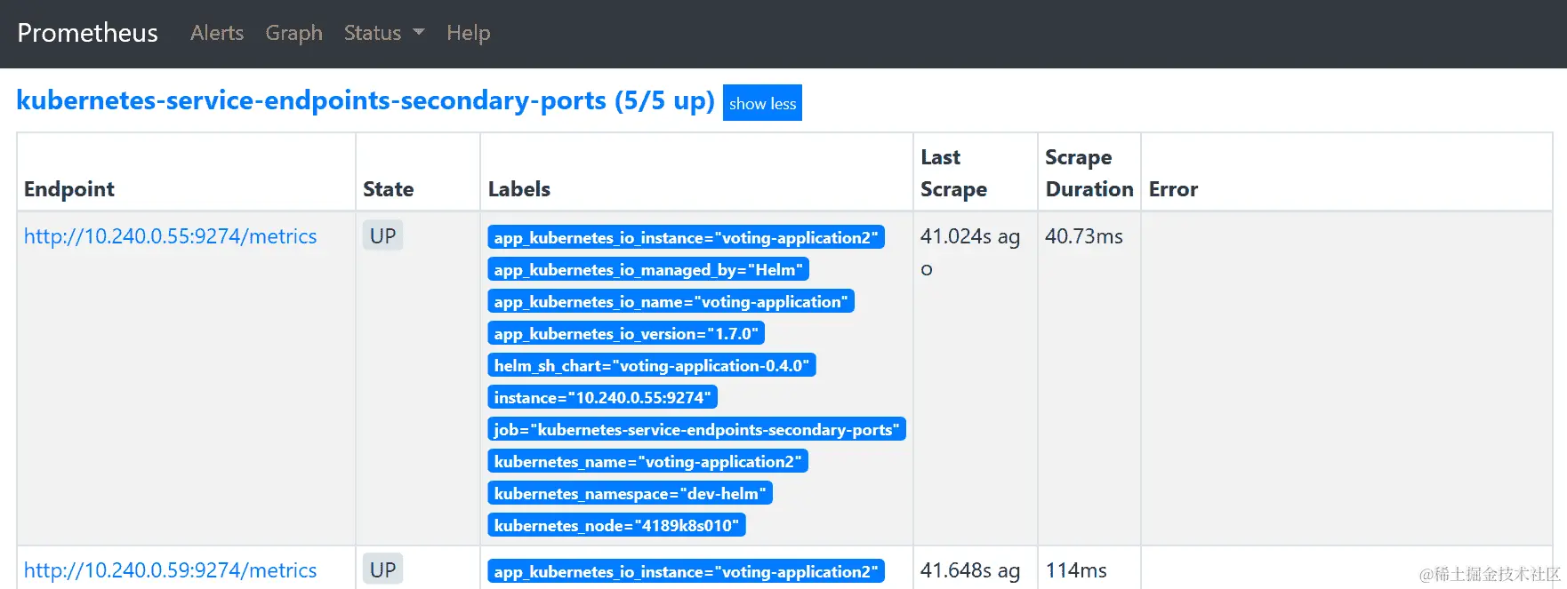 sum(increase(votingapplication_getsurveyresult_duration_seconds_bucket[2m])) by (le)。该查询将转换我们的直方图数据——我们确定了最近两分钟内每个桶的绝对增长率,并用标签le汇总每个桶,这是桶的标识符(le是 小于或等于 的缩写—Prometheus 直方图是累积的)。这样,我们就有了整个应用程序全局的桶,而不是单独的 Pod。 -
