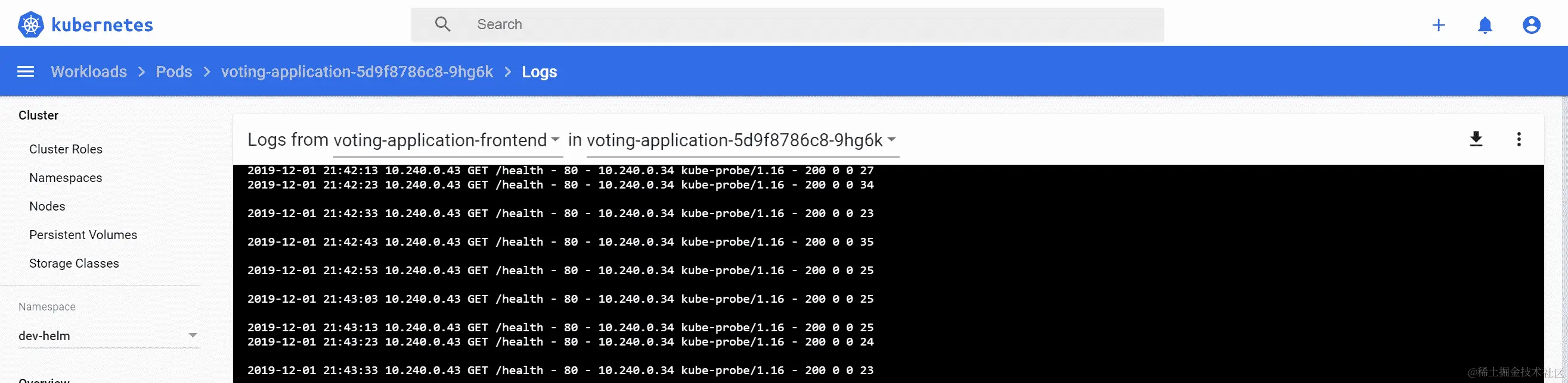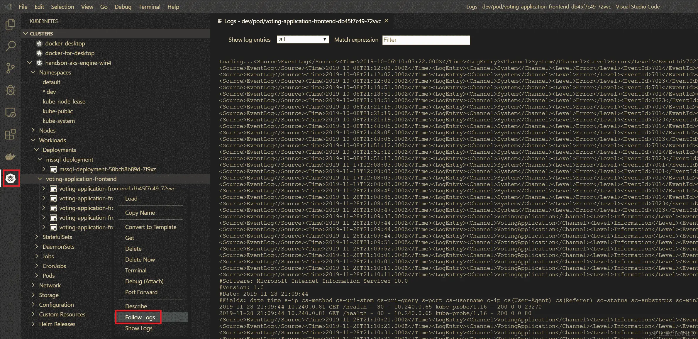 您可以从树视图或使用命令(Ctrl+Shift+P)来管理您的集群——这可以代替在 PowerShell 中执行kubectl命令。例如,您可以查看容器的日志: