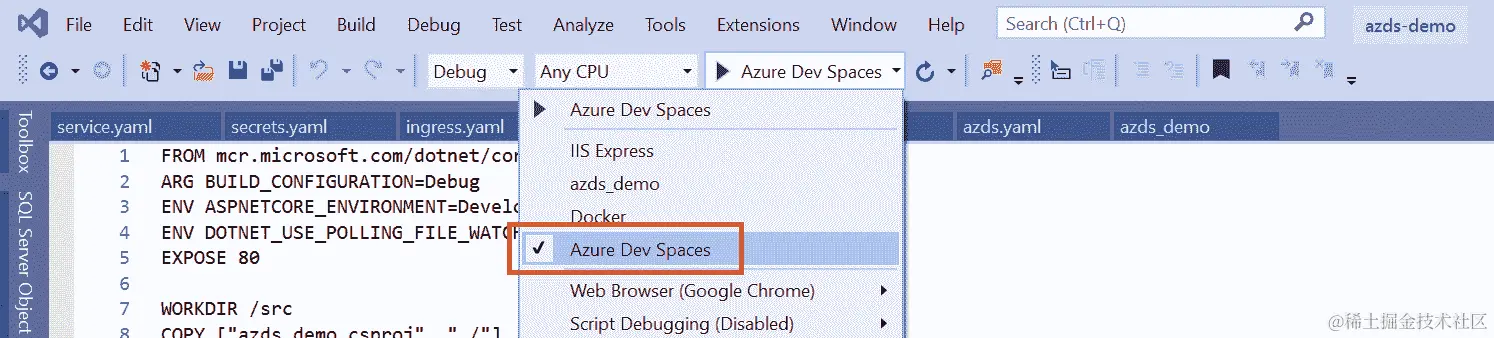 azuredevspaces.azds):启用 Azure Dev Spaces 集成,类似于您在 Visual Studio 2019 中的功能。