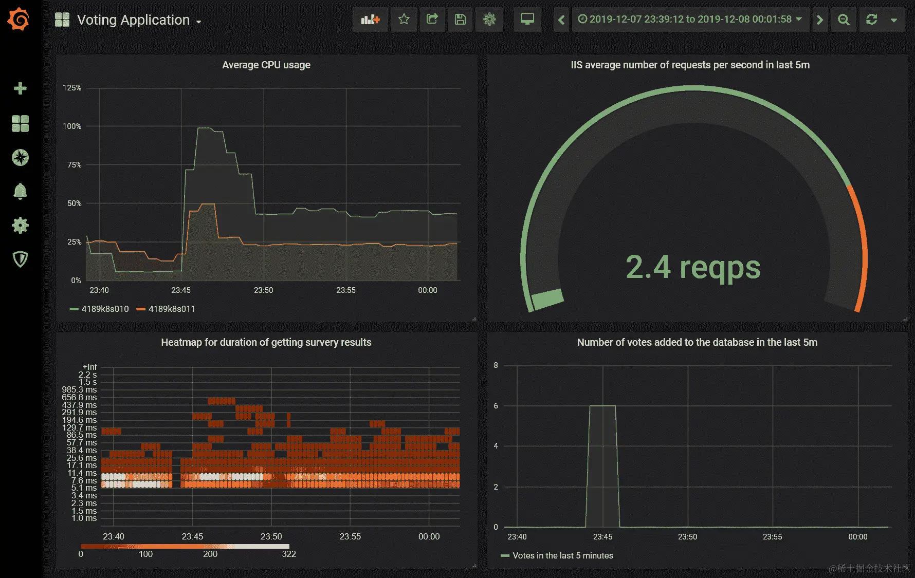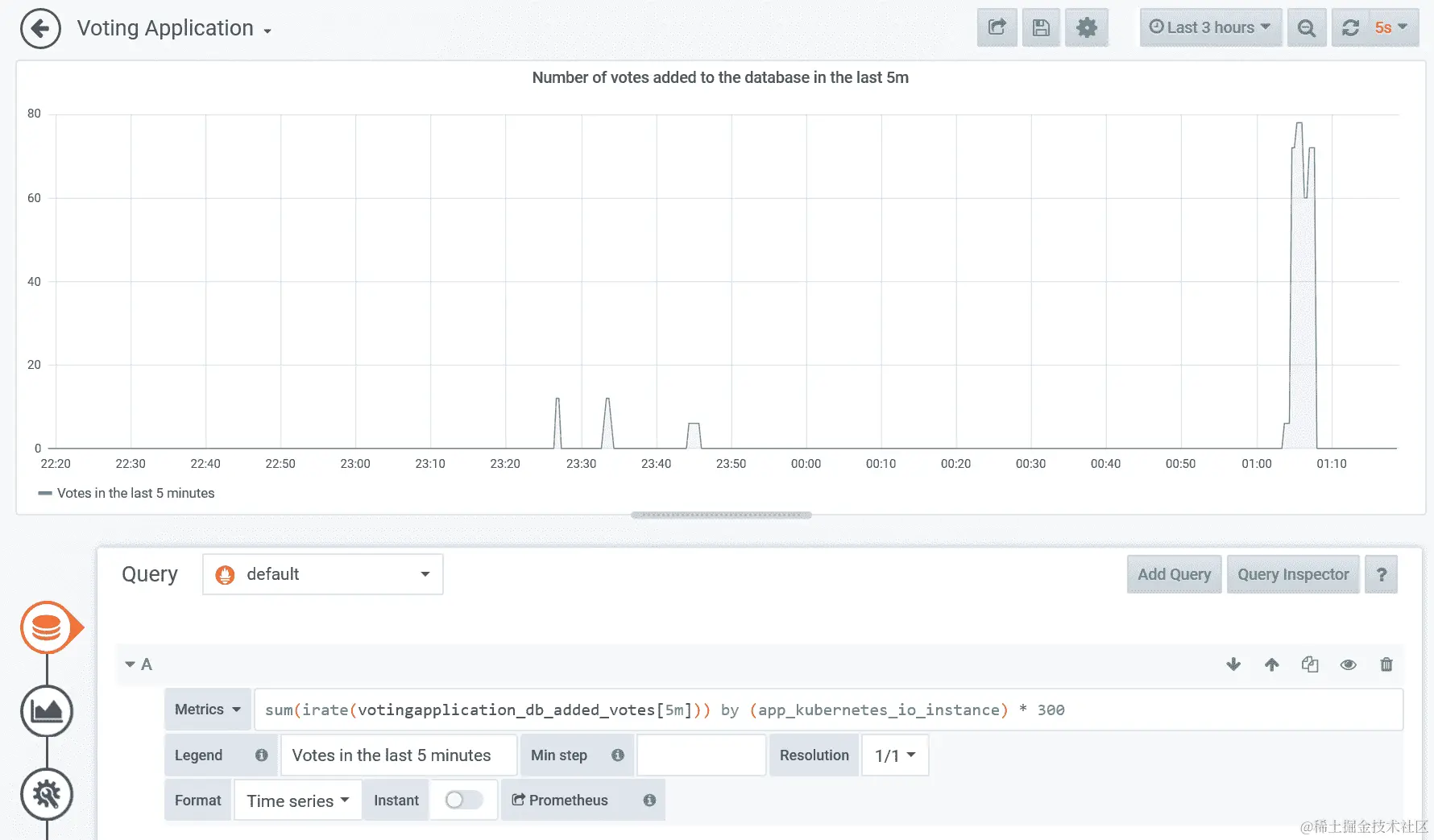 sum(irate(votingapplication_db_added_votes[5m])) by (app_kubernetes_io_instance) * 300。该查询计算了每个 Pod 在 5 分钟间隔内投票数量的增加率,并通过 Kubernetes 应用程序全局汇总。我们需要乘以300(5 分钟)因为irate计算的是每秒的速率。 -
