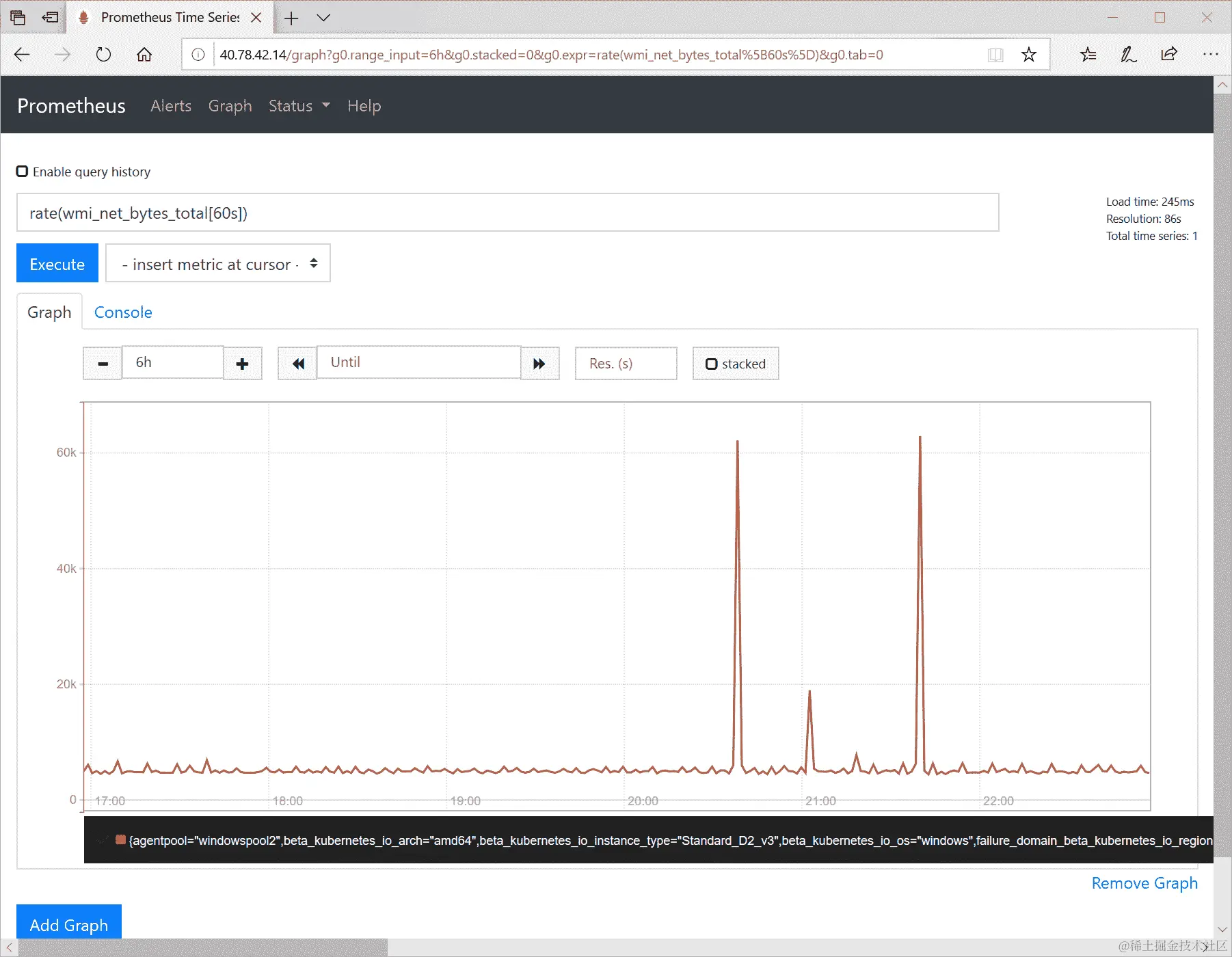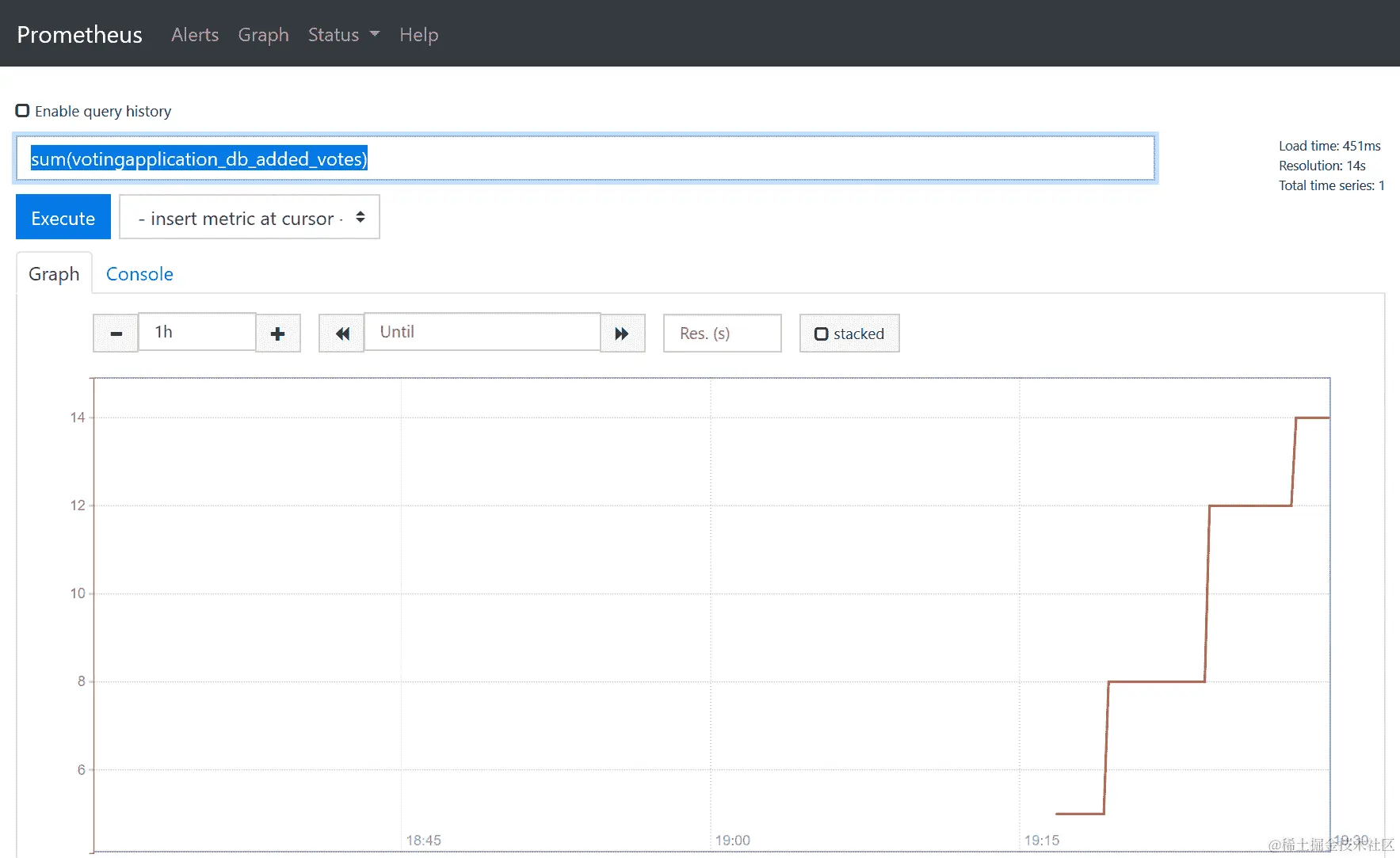 在 Prometheus web UI 的 Graph 选项卡中,运行一个示例查询来验证解决方案是否有效。例如,使用
