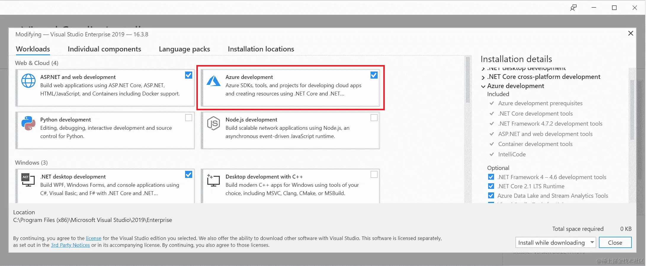 要安装 Azure 开发工作负载,请按照以下步骤操作: