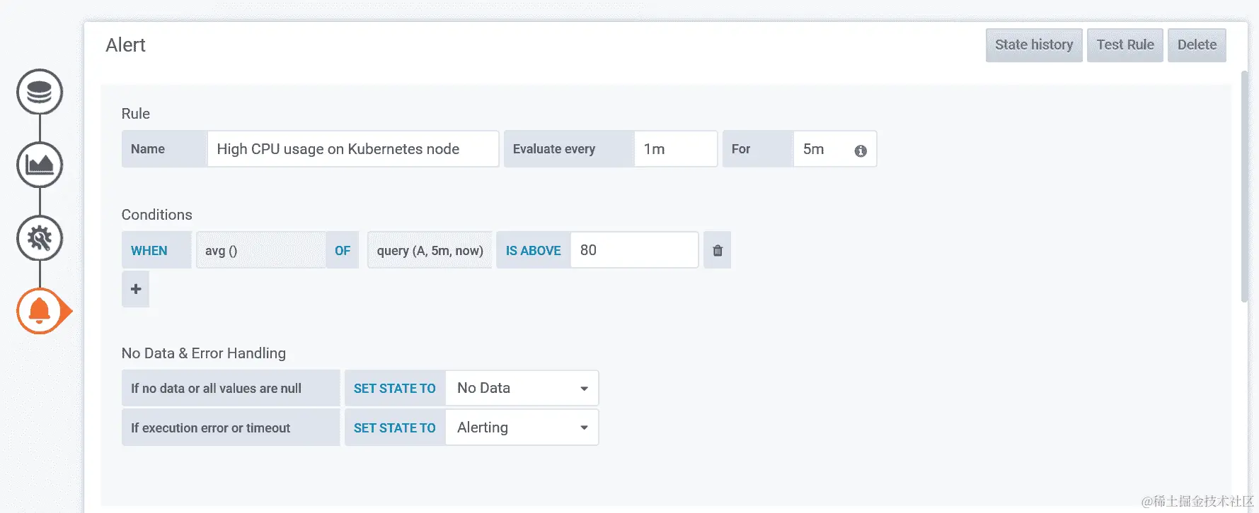 Grafana 除了创建可视化和仪表板外,还能够定义警报规则并向多个渠道发送通知。您可以在官方文档中找到支持的通知渠道列表:grafana.com/docs/grafana/latest/alerting/notifications/。警报与特定的可视化相关联,因此您首先需要为您的用例创建适当的可视化。我们将演示如何在节点上创建高 CPU 使用率的警报。
