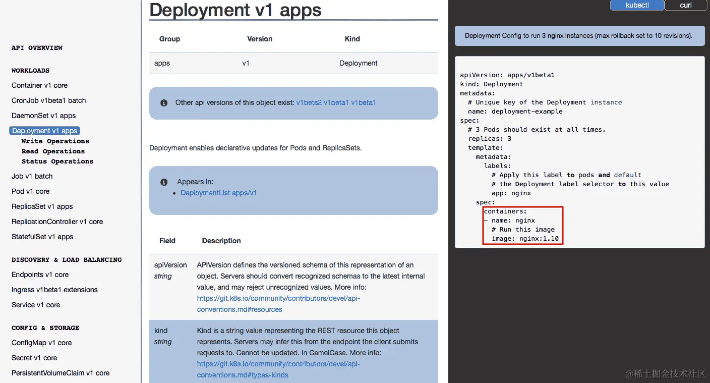 但是,我们如何知道在前面图像的标记位置设置容器部分的详细信息?在对象描述的字段部分,有两个值。第一个,如 apiVersion,表示名称,第二个,如 string,是类型。类型可以是整数、字符串、数组或其他资源对象。因此,要搜索部署的容器配置,我们需要了解对象的层次结构。首先,根据网页上的示例配置文件,到容器的对象层是spec.template.spec.containers.。因此,首先点击 Deployment 的字段下的超链接 spec DeploymentSpec,这是资源对象的类型,并进行分层搜索。最后,您可以在此页面上找到列出的详细信息:kubernetes.io/docs/reference/generated/kubernetes-api/v1.10/#container-v1-core。