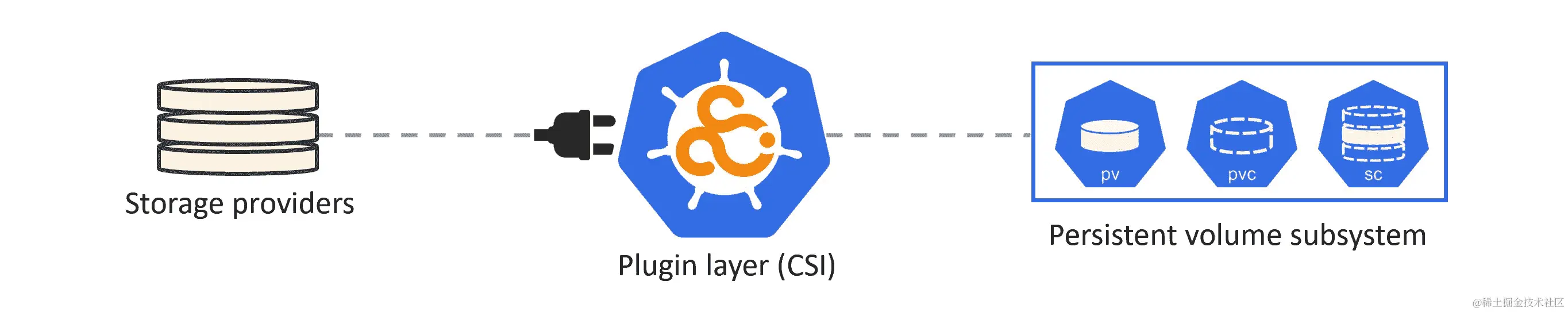 该模型的高级架构包括存储提供程序、插件接口和 Kubernetes 持久卷子系统。
