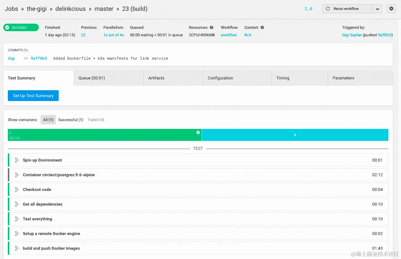 对于 CI,我考虑了 Travis CI 和 CircleCI。两者都为开源项目提供免费的 CI 服务。我选择了 CircleCI,因为它更具备功能完备,并且具有更好的用户界面,这很重要。我相信 Travis CI 也会很好用。我在其他一些开源项目中使用 Travis CI。重要的是要注意,流水线的 CI 部分完全与 Kubernetes 无关。最终结果是镜像仓库中的 Docker 镜像。这个 Docker 镜像可以用于其他目的,而不一定要部署在 Kubernetes 集群中。
