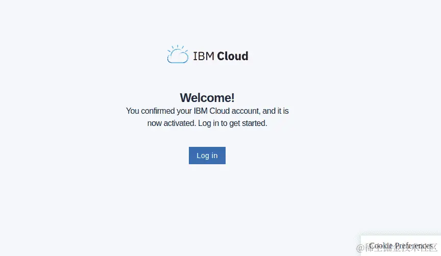- 当您点击邮件中的确认账户按钮时,我们将被带到 IBM Cloud 欢迎页面。点击登录按钮,使用注册 IBM Cloud 时使用的凭据登录,如下图所示: