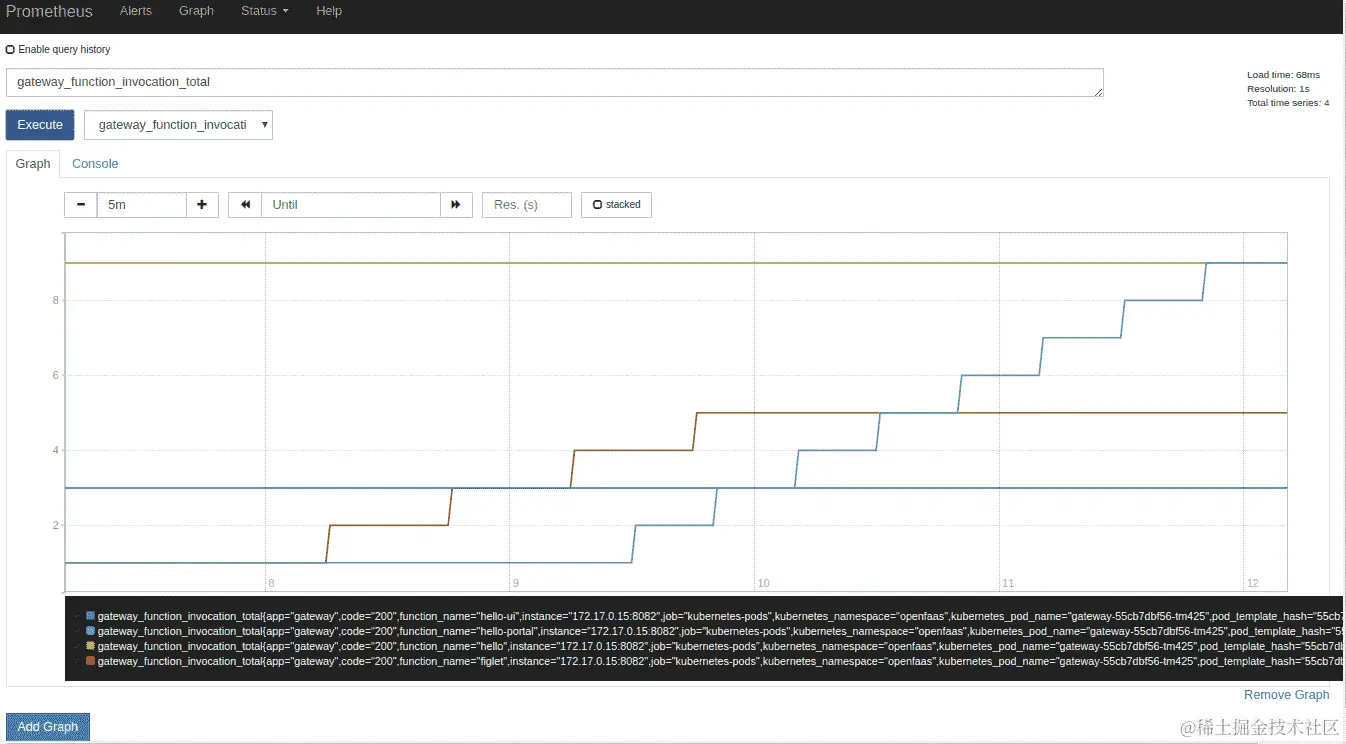 转到Grafana门户,并观察figlet函数的副本数量增加。一旦负载完成,副本计数将开始缩减,并返回到com.openfaas.scale.min计数为 1 个函数副本。