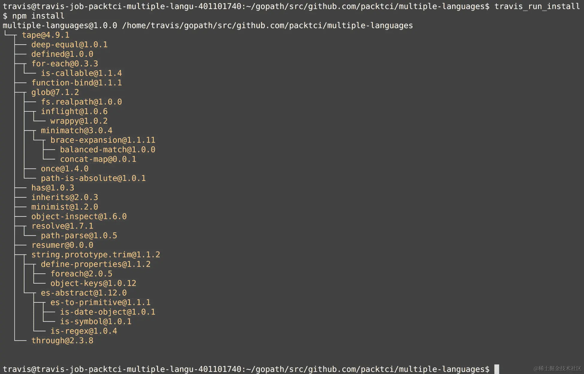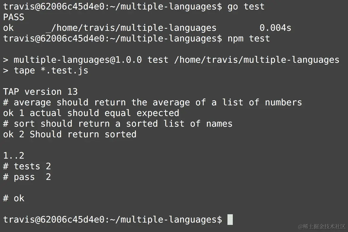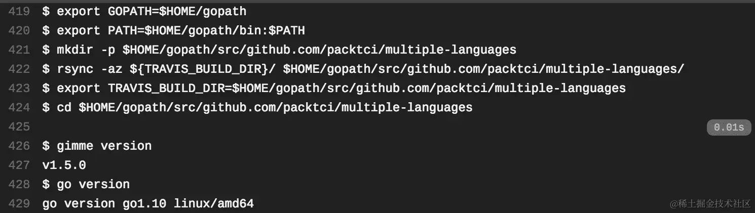 请注意,Travis CI 为我们设置了一些环境变量,包括GOPATH和PATH环境变量。Travis CI 运行go version命令来验证 CI 构建中是否安装了 Go 版本 1.10: