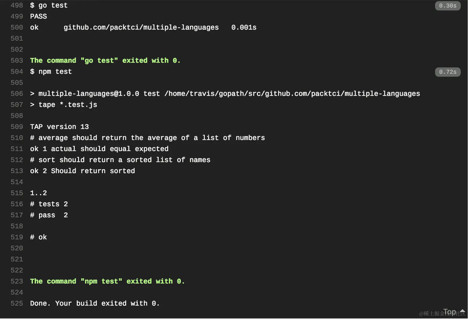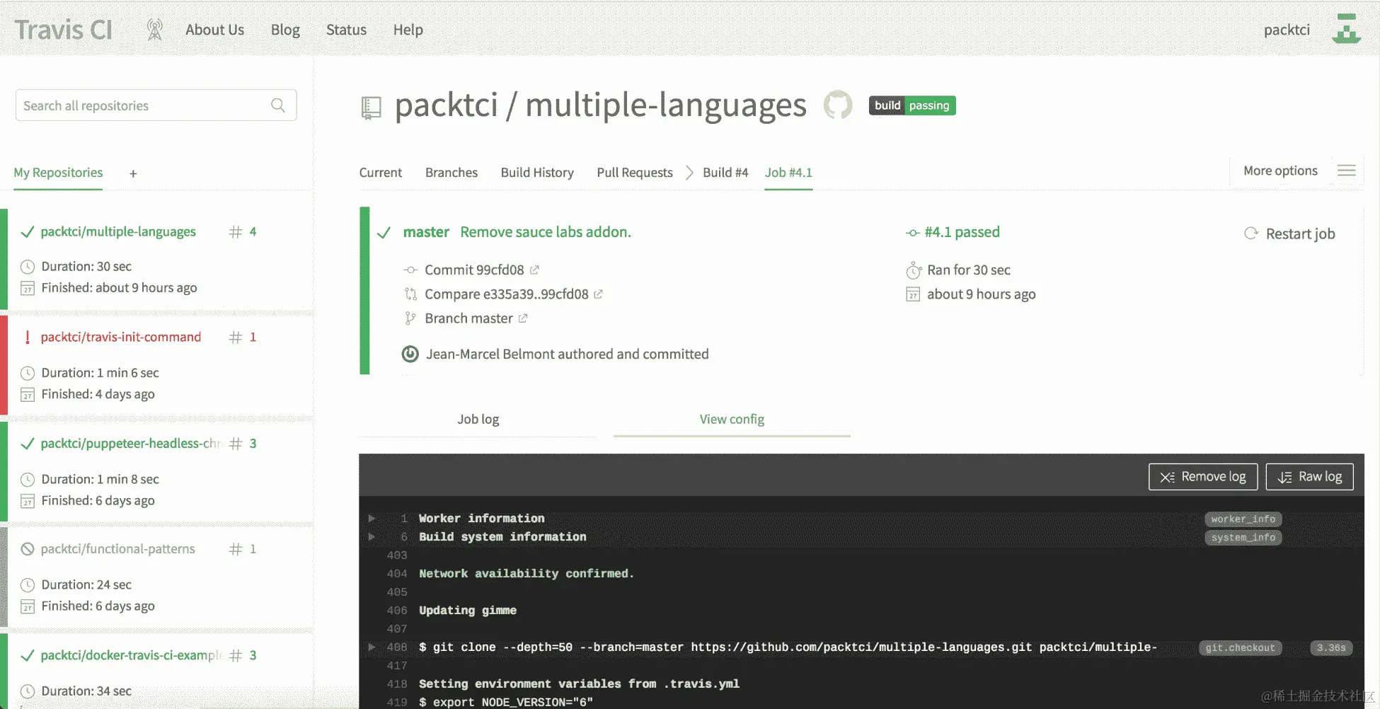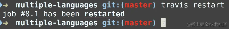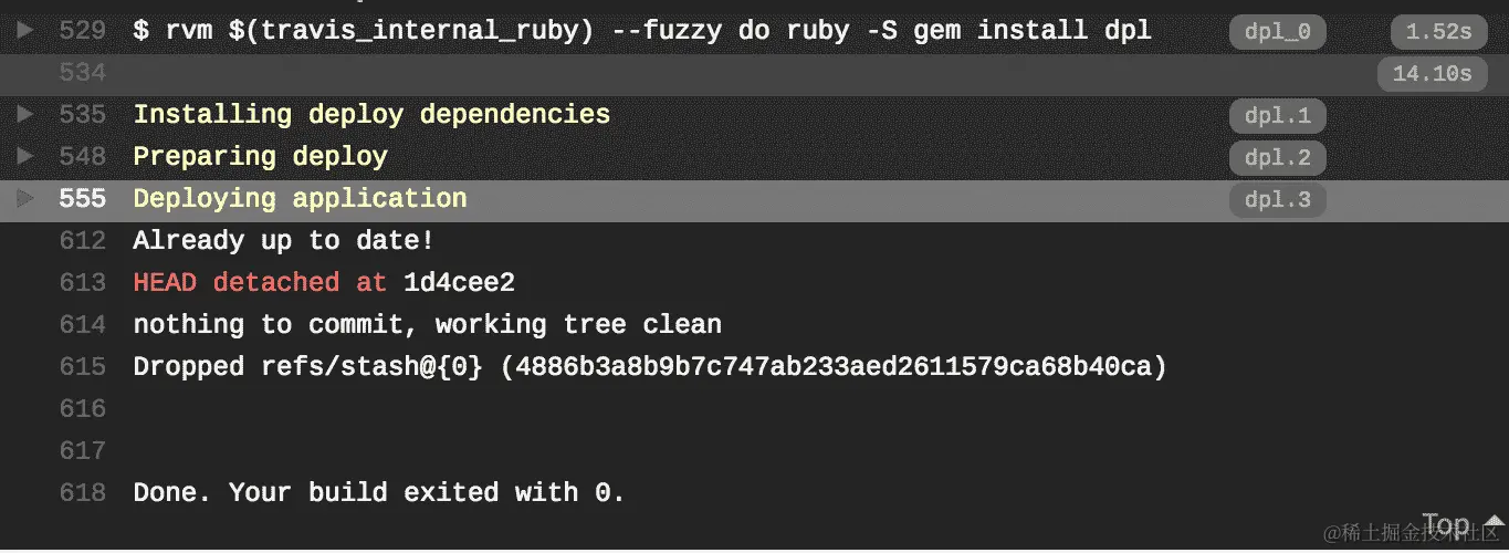 如果您返回 Travis web UI 并查看当前作业日志,您将看到以下内容: