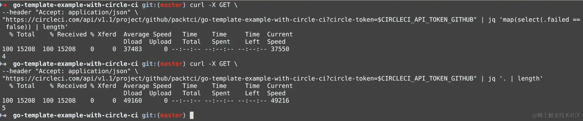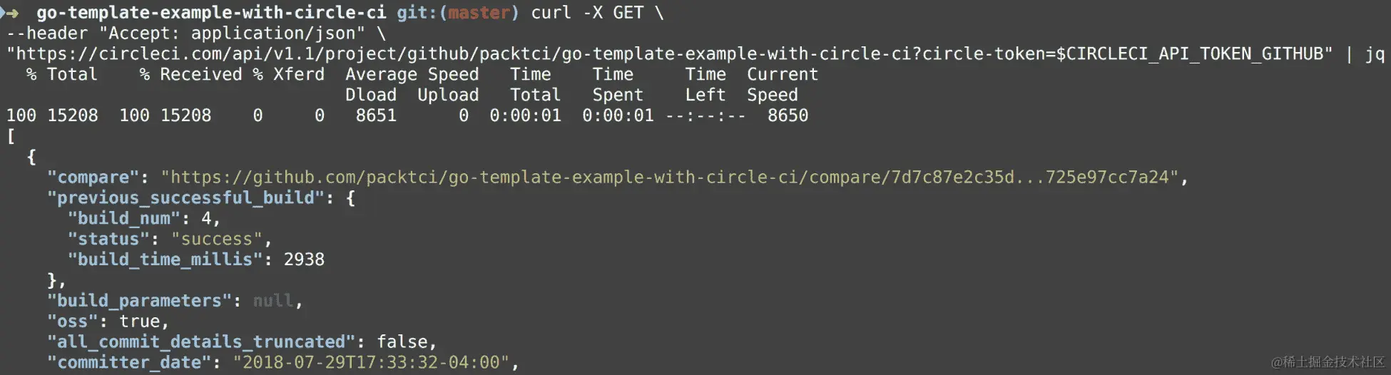 请注意,在此截图中,我们添加了 Authorization HTTP 标头,并使用 Travis CLI 通过 Bash 字符串插值打印出我们的访问令牌: