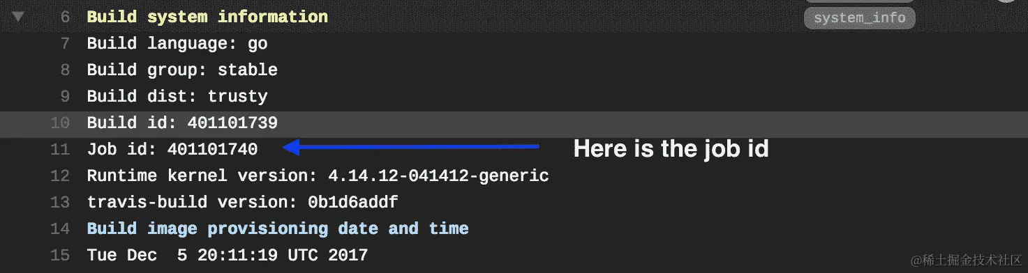 您可以通过展开“构建系统信息”选项卡并查找“作业 ID”标签来获取作业 ID。在下面的截图中,有一个箭头指向“作业 ID”:
