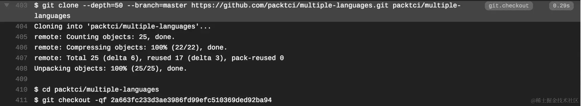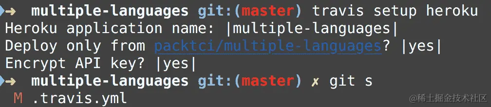 Travis CI 克隆了multiple-languages存储库的新副本,这是持续集成的重要方面。请记住,CI 构建应该在每次构建时构建一个新副本,并且不应该有任何假设的环境变量:
