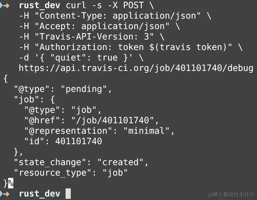 要通过 API 重新启动调试模式的作业,您需要向作业的调试端点发送一个 POST 请求。此请求需要通过将您的 Travis CI API 令牌添加到授权标头来进行身份验证。您可以在 Travis CI 个人资料页中找到您的 API 令牌,用于公共项目。