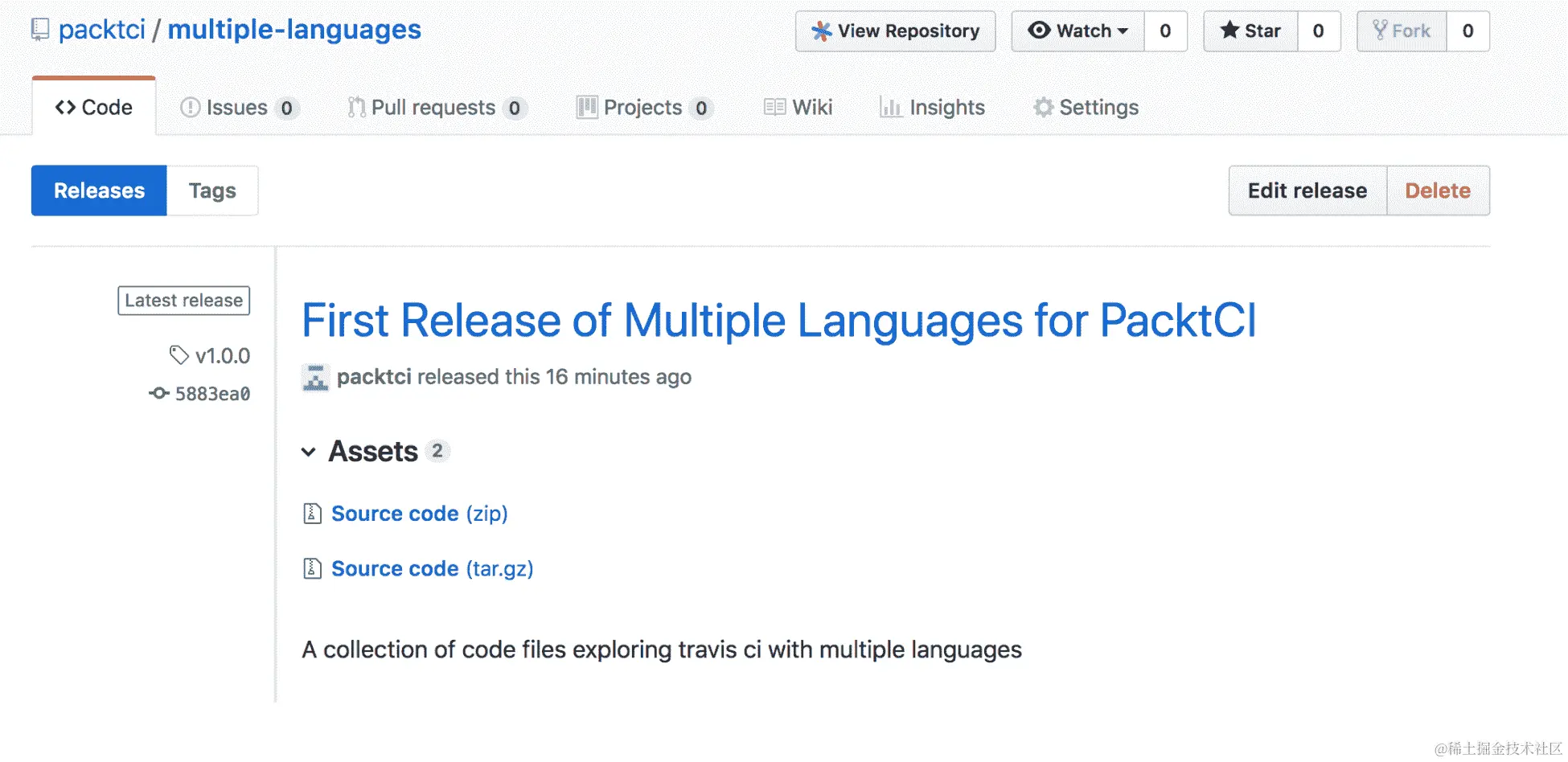 让我们转到multiple-languages(github.com/packtci/multiple-languages/releases)存储库中的 Releases 选项卡,并单击我们的新发布,它看起来像这样: