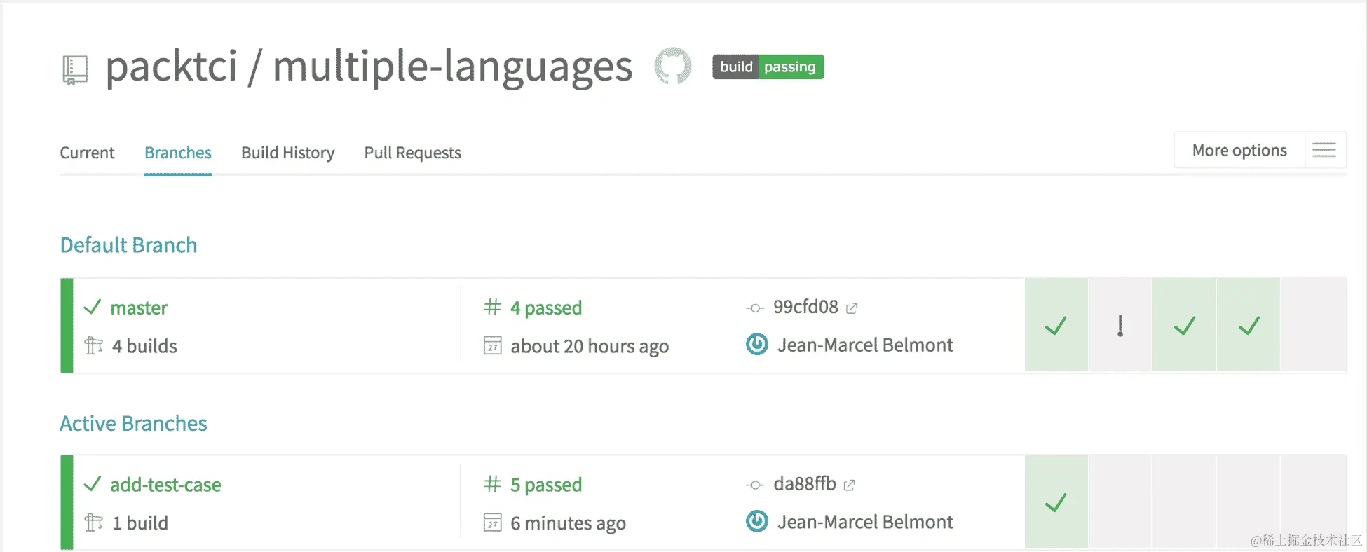 在右侧分割的部分,您将找到 Travis Web 客户端的主要导航组件。请注意,这里有几个导航链接,例如当前构建,这是您转到存储库时打开的默认链接。如果单击 Branches 链接,您将看到在所有不同分支上触发的所有构建,包括拉取请求。让我们推送一个新分支并在multiple-languages(github.com/packtci/multiple-languages)存储库中创建一个拉取请求,看看新的构建如何运行: