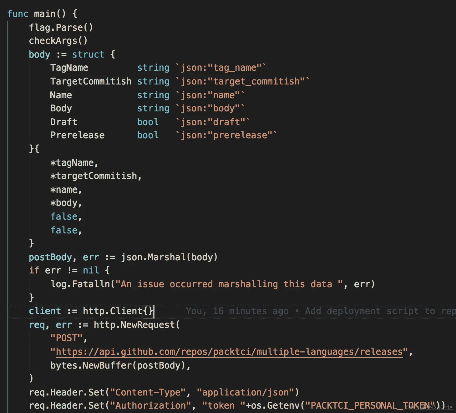 现在,在脚本的第二部分中,我们在main函数中,解析命令行参数,然后调用我们的checkArgs函数。接下来,我们创建一个匿名结构,用于创建我们的请求体,然后设置 HTTP 请求并设置 HTTP 头。在脚本的最后部分,我们发出请求并打印发布 URL。