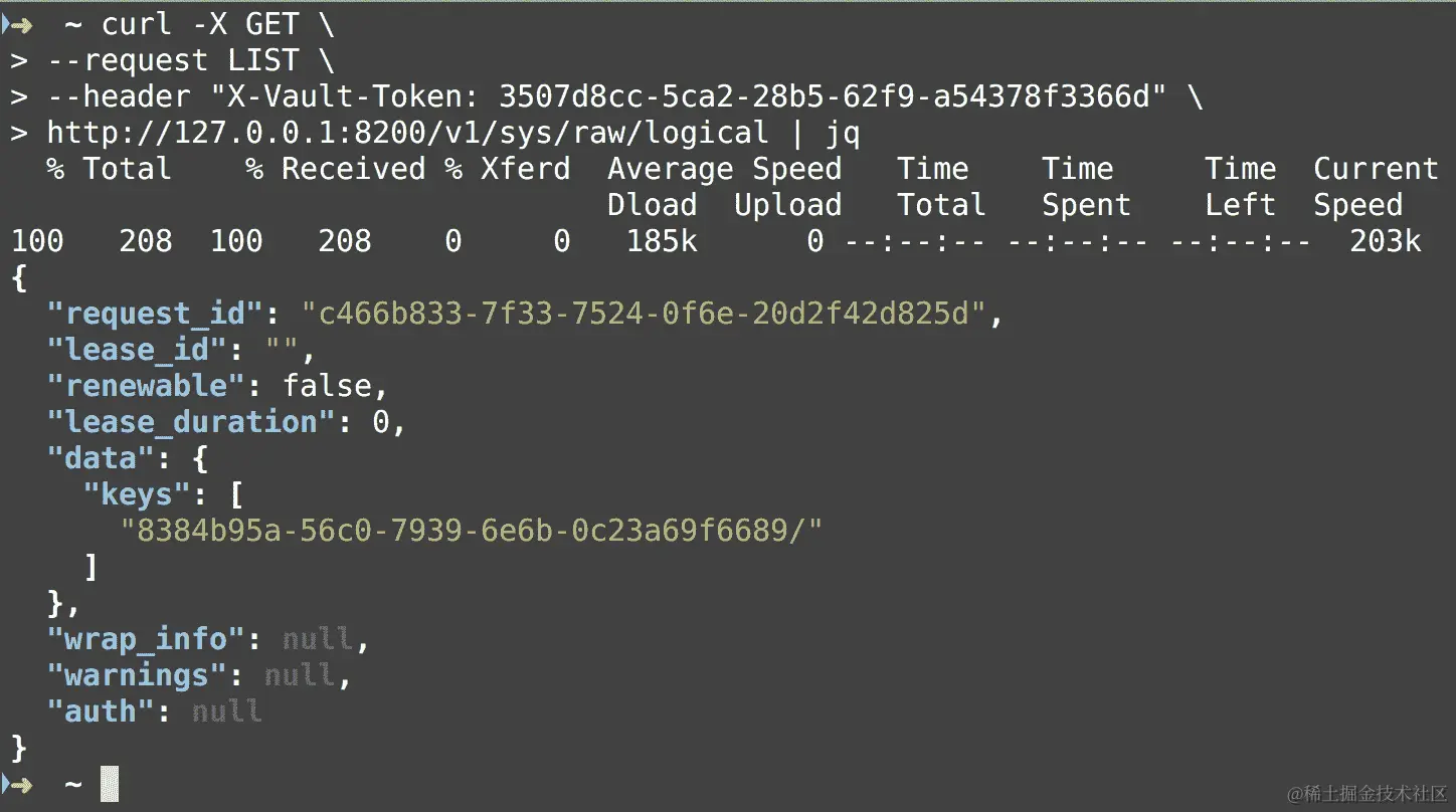 请注意,我们在运行 Vault 登录ROOT_KEY命令后从标准输出中打印出的令牌。此端点返回给定路径的密钥列表,在本例中为/sys/raw/logical。
