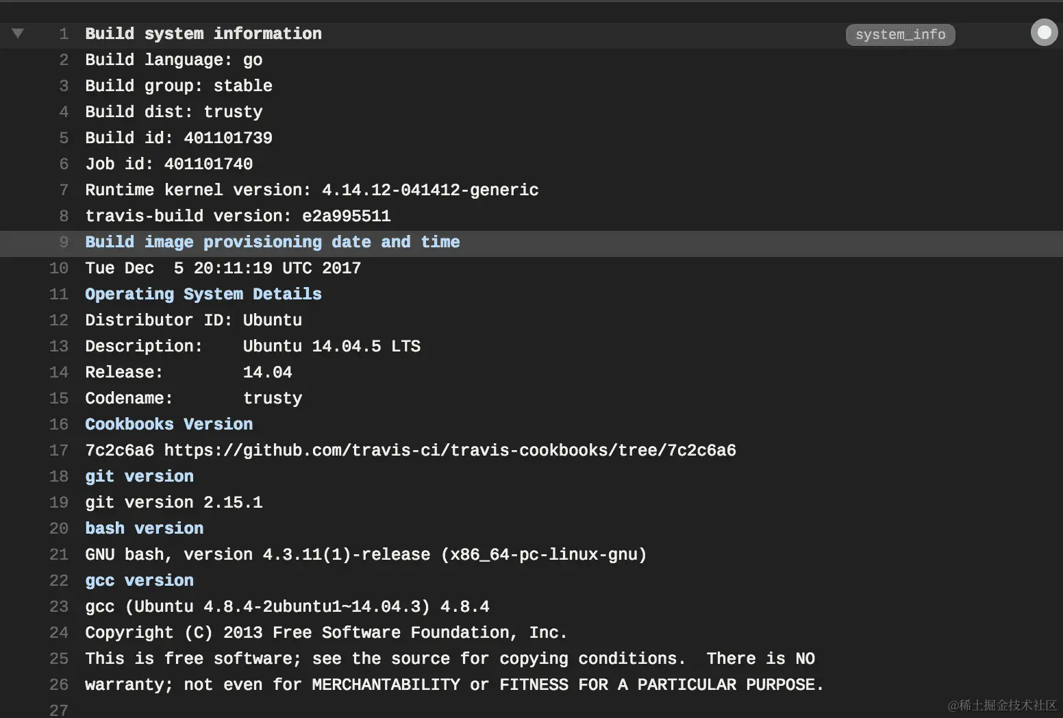 Travis CI 中的作业日志以构建系统配置信息开始:
