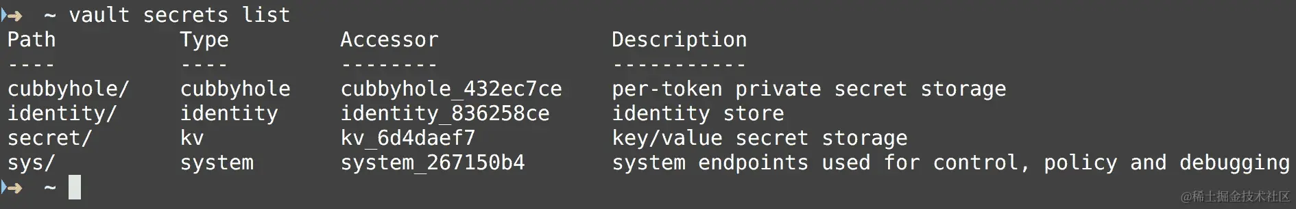 我们还可以列出 Vault 中的所有秘密,如下所示: