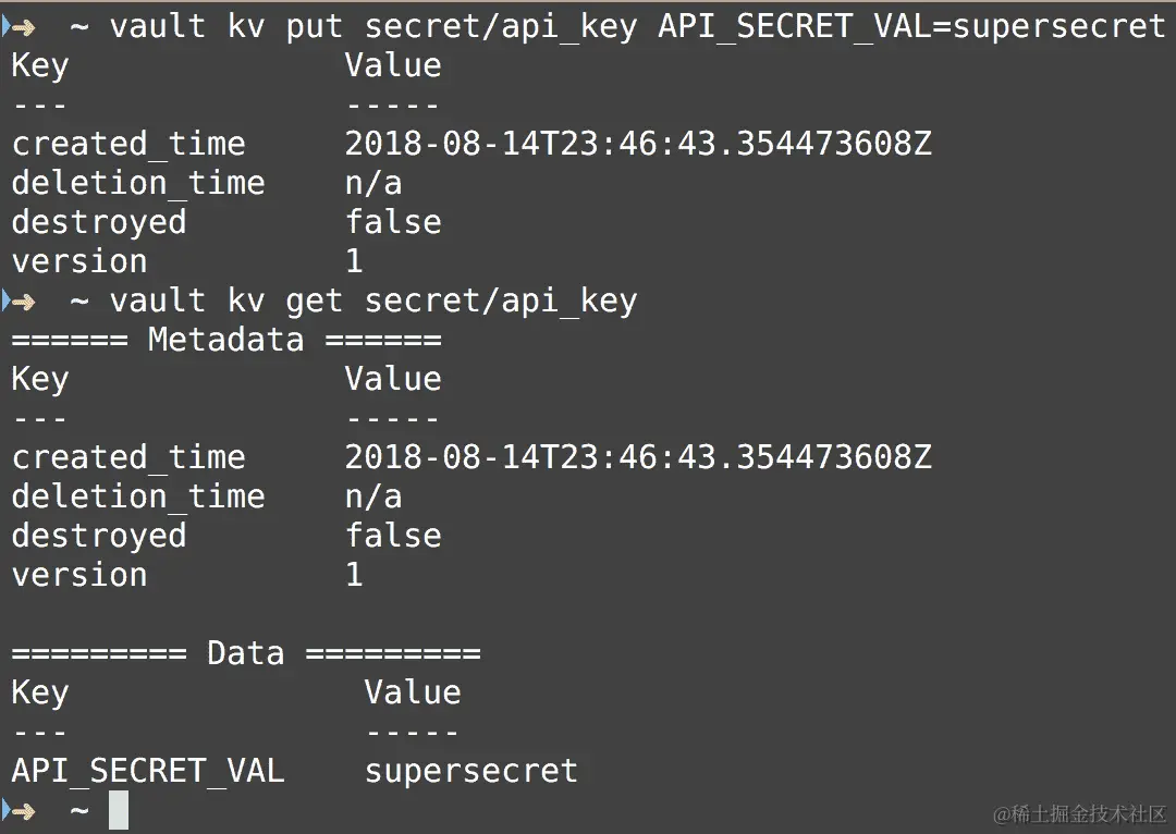 在以下截图中,我们设置了一个 API 密钥,然后使用 Vault 检索它: