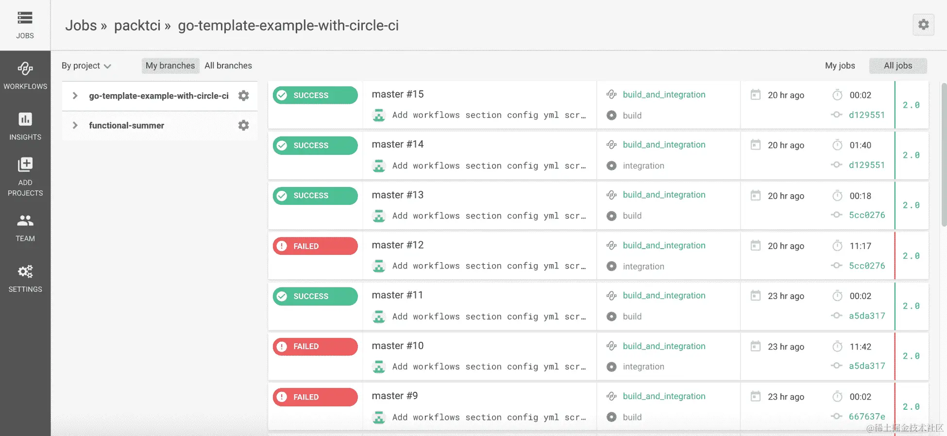 在左侧分割的部分,您可以单独点击您感兴趣的每个存储库。此外,您可以按名称搜索存储库,因为您或您所属的组织可能拥有许多存储库。还请注意,有关上次在项目中运行的最后一个构建以及它是否通过或失败的详细信息,以及有关持续时间和上次运行构建的详细信息。