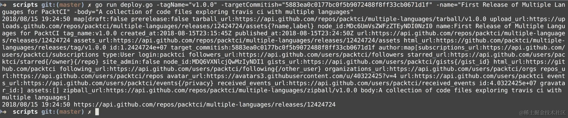 请注意,我们在go run deploy.go之后提供了四个命令行参数,脚本在最后打印出了发布 URL。