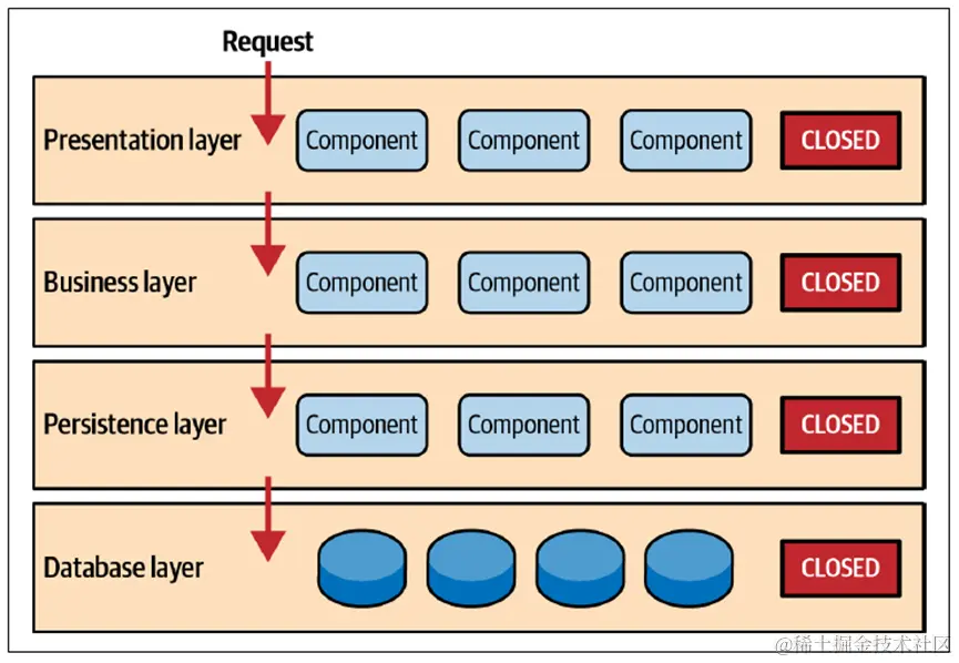 如上图请求必须沿着一定的方向逐层传递,不能跨层——每一层都是 closed 的,这样做的好处是隔离了变化,某一层的变化只影响相邻层,而不会影响其他层。 特殊情况下,某层也可以设置为 open —— 即允许被跨越。