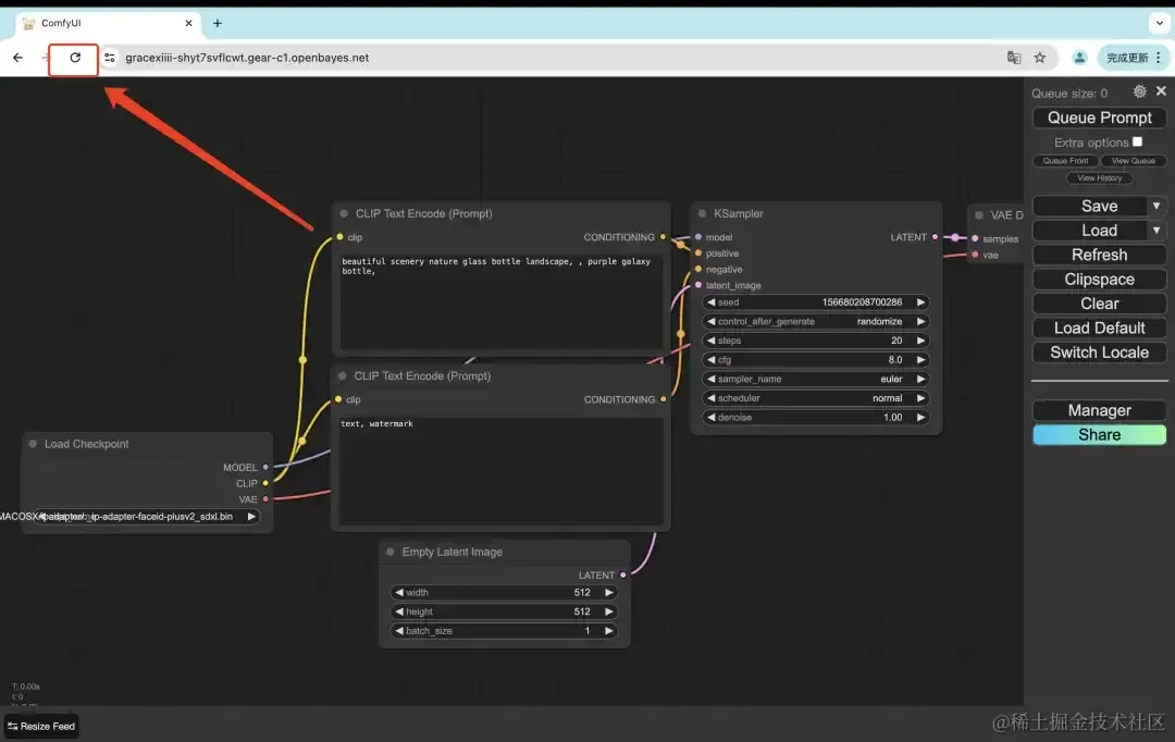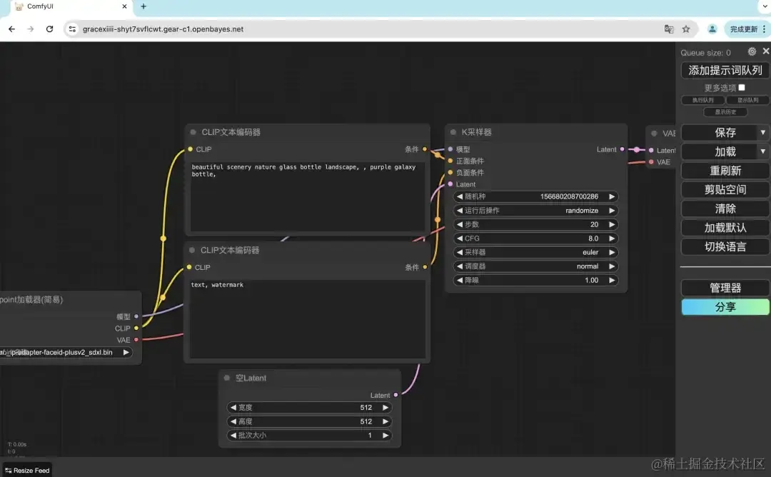 - 当命令行出现「https://0.0.0.0:8080」后,拷贝右侧 API 地址到浏览器地址栏中,即可打开 ComfyUI 界面。请注意,用户需在实名认证后才能使用 API 地址访问功能。