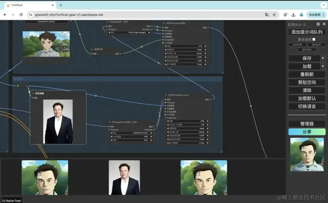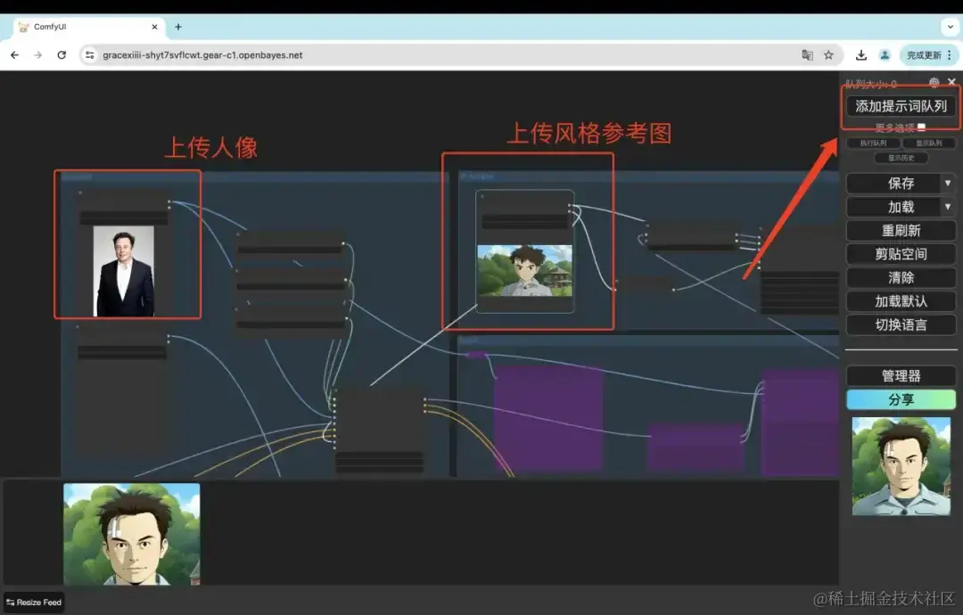 - 在 InstantID 节点上传 1 张人像图,在 IP-Adapter 节点上传 1 张风格参考图后,点击「添加提示词队列」即可生成风格迁移后的图像。