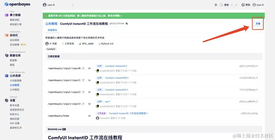 此外,该教程直接帮助用户提前下载了模型组,并在云端部署,还为用户搭建好工作流,一键即可克隆使用。这无疑很大程度上降低了 ComfyUI 的使用门槛,再也不用担心节点连接错误了!