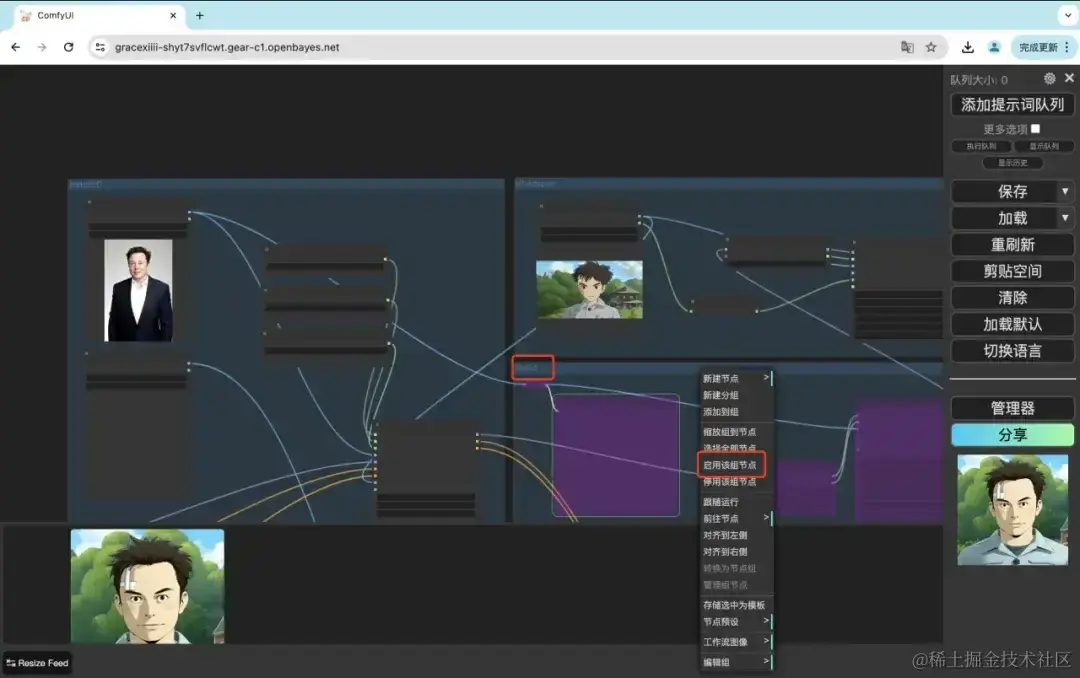 - 如果想要追求更好的效果,可以在「FaceID」节点单击右键,选择「启动该组节点」后,点击「添加提示词队列」,会生成效果更真实的风格迁移图片。
