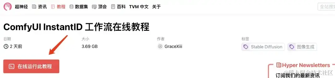 - 登录 hyper.ai,在「教程」页面,选择「ComfyUI InstantID 工作流在线教程」。点击「在线运行此教程」。