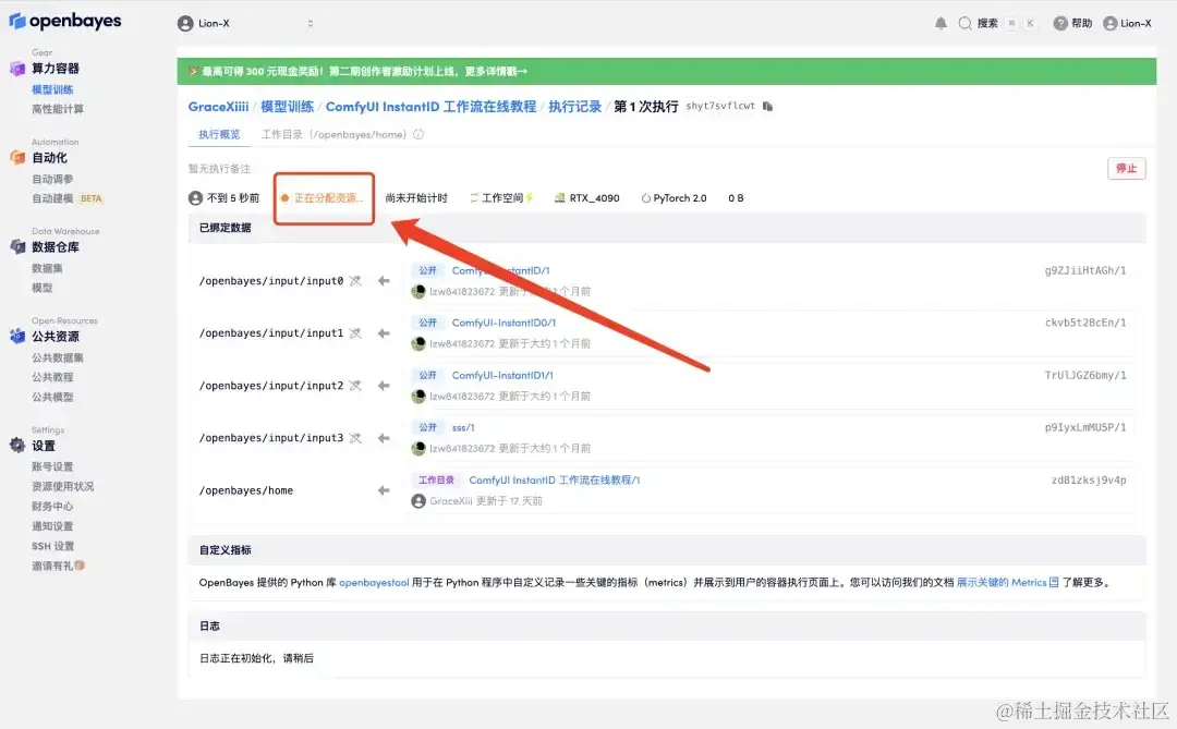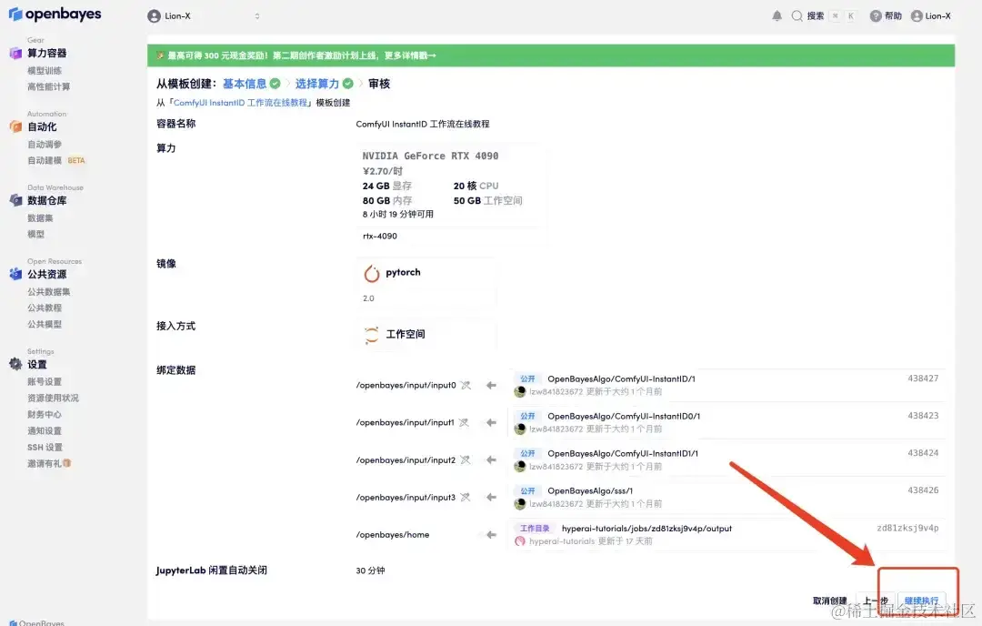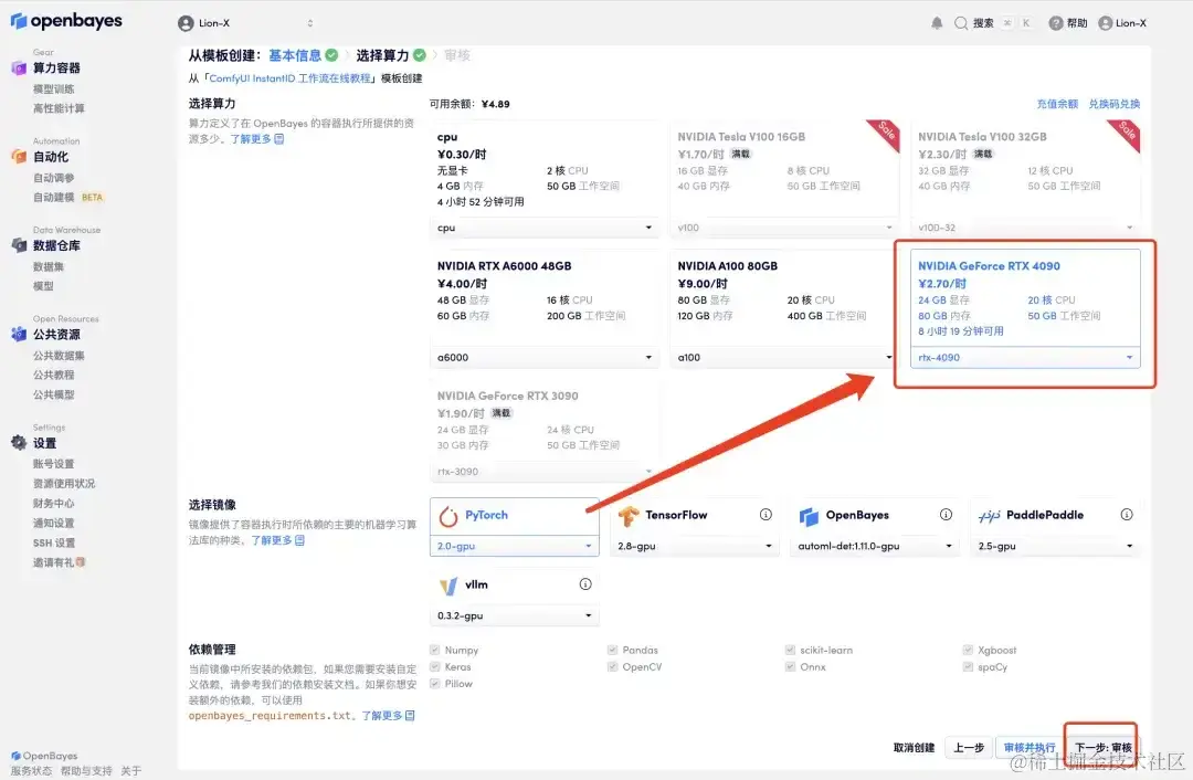 - 跳转后,选择「NVIDIA GeForce RTX 4090」,点击「下一步:审核」。新用户使用下方邀请链接注册,可获得 4 小时 RTX 4090 + 5 小时 CPU 的免费时长!
