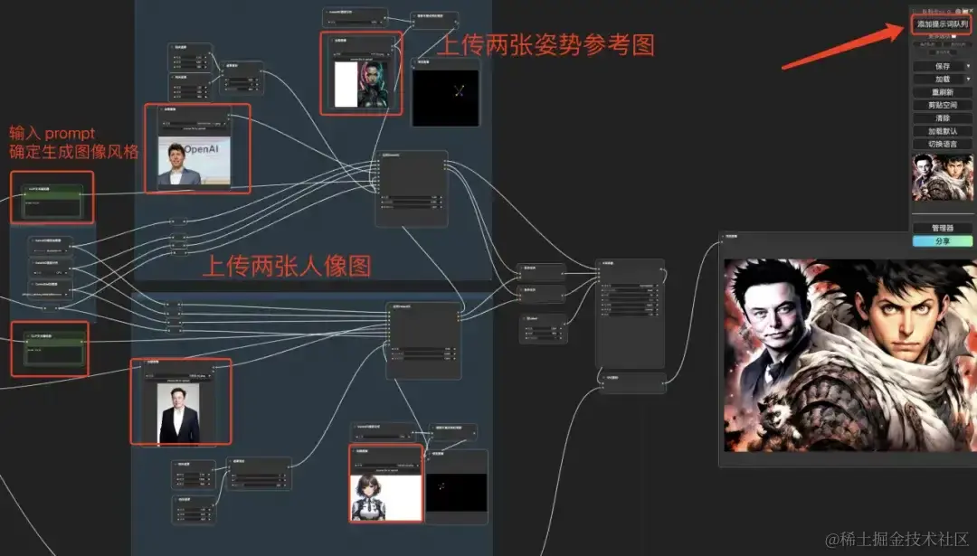 切换工作流后,上传想要融合的两个不同人物图像,以及各自的姿势参考图像,输入 prompt 确定生成图片风格,请注意,姿势参考图像脸部的位置需要分布在左右两侧。