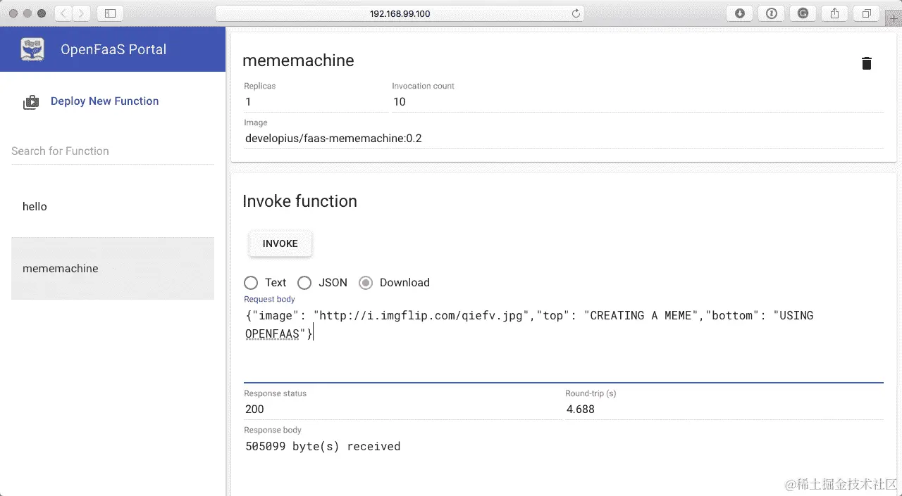 我们可以启动我们的函数,但是首先我们需要将 Minikube VM 的 IP 地址放入一个变量中,这样当我们运行 OpenFaaS CLI 时,它就知道要连接到哪里: