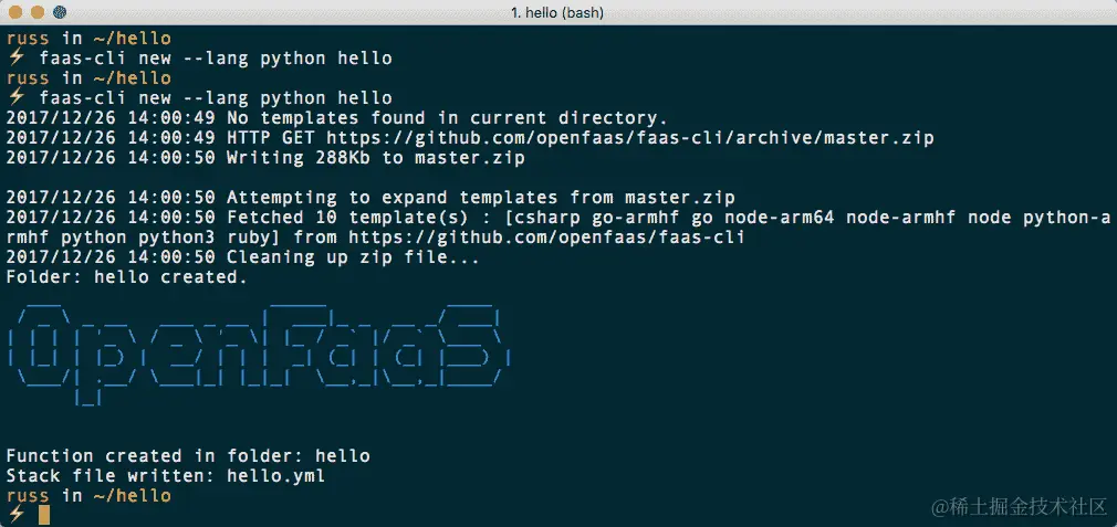 与我们涵盖的其他服务一样,我们将运行一个快速的 hello world 示例。这将让您了解 OpenFaaS 和其他工具之间的区别。我们还将找出为什么需要安装 Docker。首先,运行以下命令: