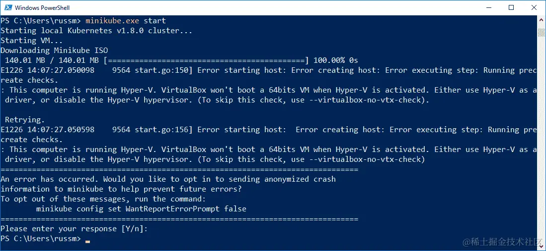 这将启动集群并配置我们的本地 Kubernetes CLI 与之通信,除非您安装了 Windows 10 专业版,然后您可能会看到以下消息: