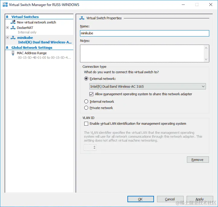 为此,打开 Hyper-V Manager,选择 Virtual Switch Manager,然后创建一个新的外部虚拟交换机。如下截图中所示,将其命名为minikube,并确保选中“允许管理操作系统共享此网络适配器”复选框: