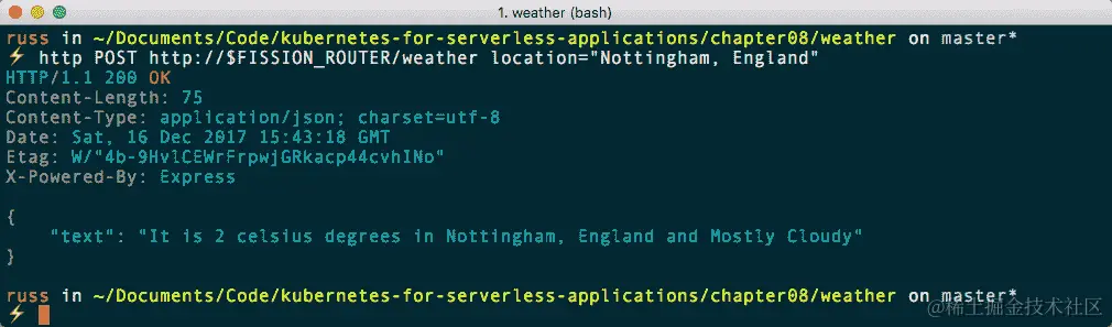 $ curl -H "Content-Type: application/json" -X POST -d '{"location":"Nottingham, England"}' http://$FISSION_ROUTER/weather