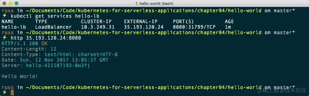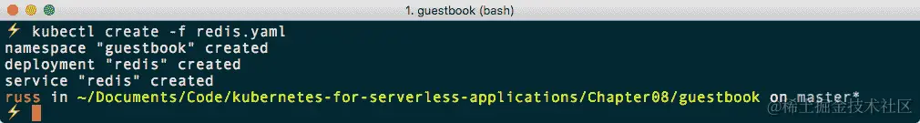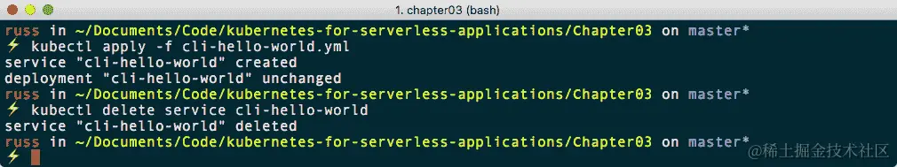 现在我们需要在默认命名空间中启动一个服务。为此,切换到 /Chapter03/ 文件夹并运行以下命令: