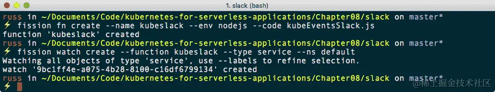 $ fission function create --name kubeslack --env nodejs --code kubeEventsSlack.js