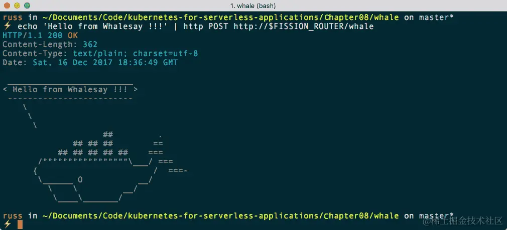 $ curl -X POST -H "Content-Type: text/plain" --data 'Hello from Whalesay !!!' http://$FISSION_ROUTER/whale
