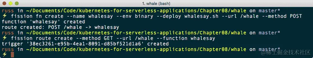 $ fission function create --name whalesay --env binary --deploy whalesay.sh --url /whale --method POST
