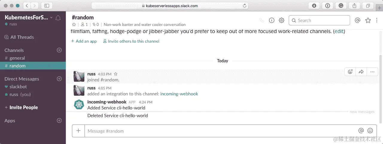 在这个例子中,我们将在当前 Kubernetes 安装的默认命名空间中每次创建或删除服务时发布一条消息。这些消息将通过名为 Slack 的 Webhook 发布到一个名为 Slack 的群组消息服务中。