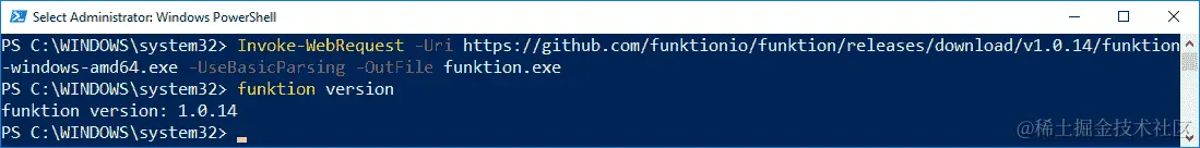 $ Invoke-WebRequest -Uri https://github.com/funktionio/funktion/releases/download/v1.0.14/funktion-windows-amd64.exe -UseBasicParsing -OutFile funktion.exe