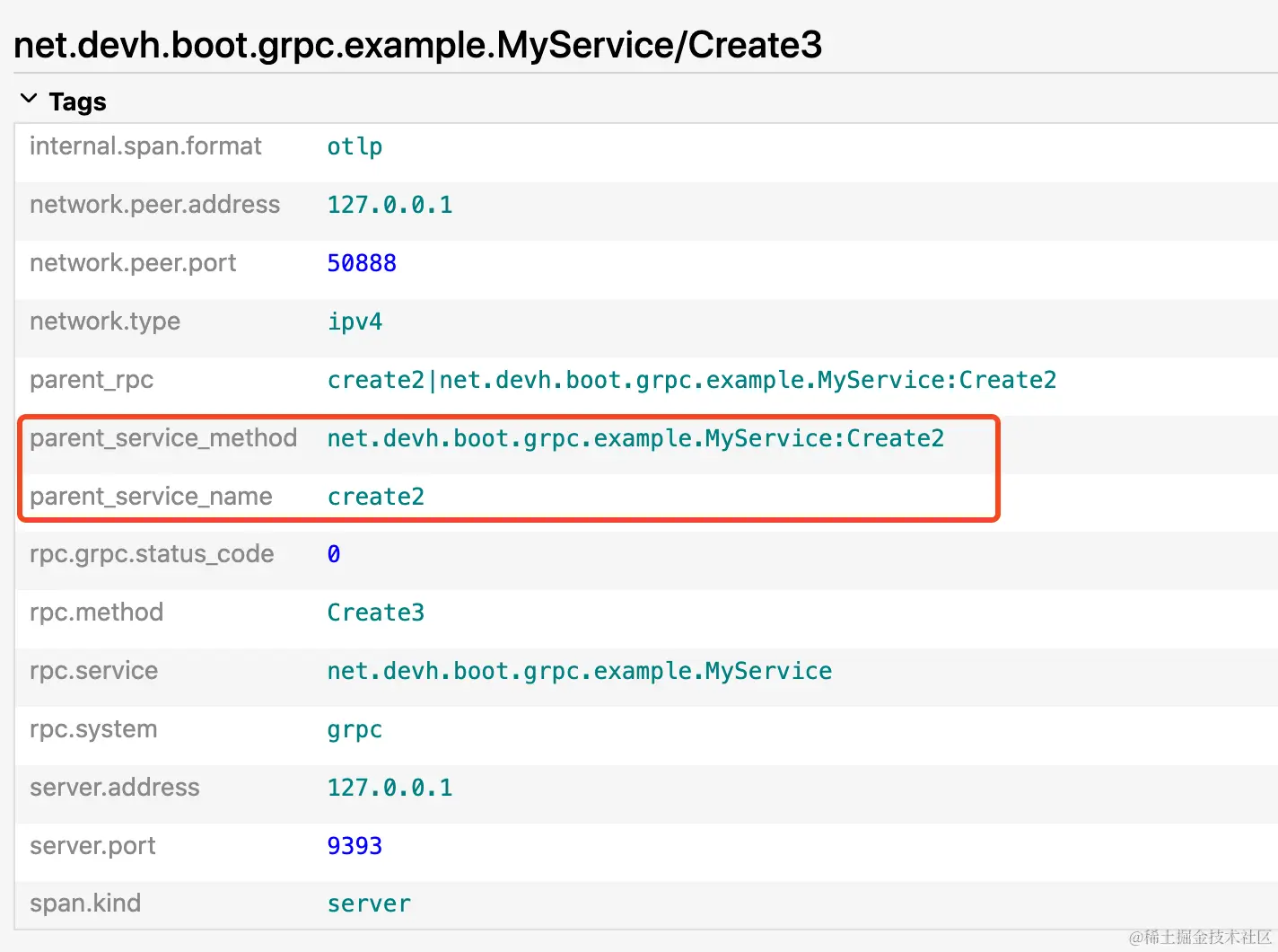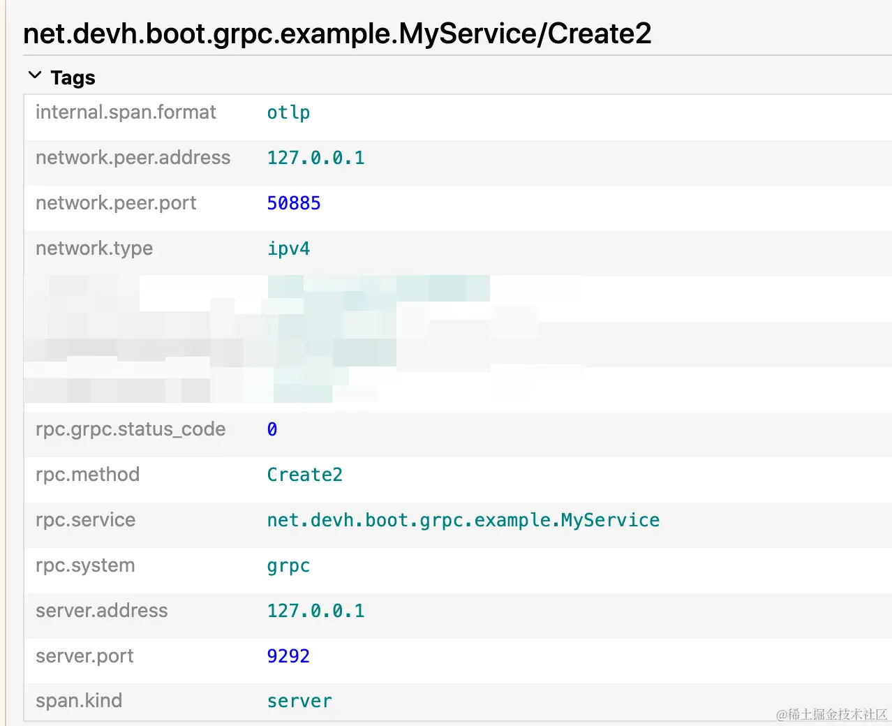 这些都是当前一些当前 span 内置的信息,比如当前 gRPC 接口的一些基本数据:服务名、ip、端口等信息。