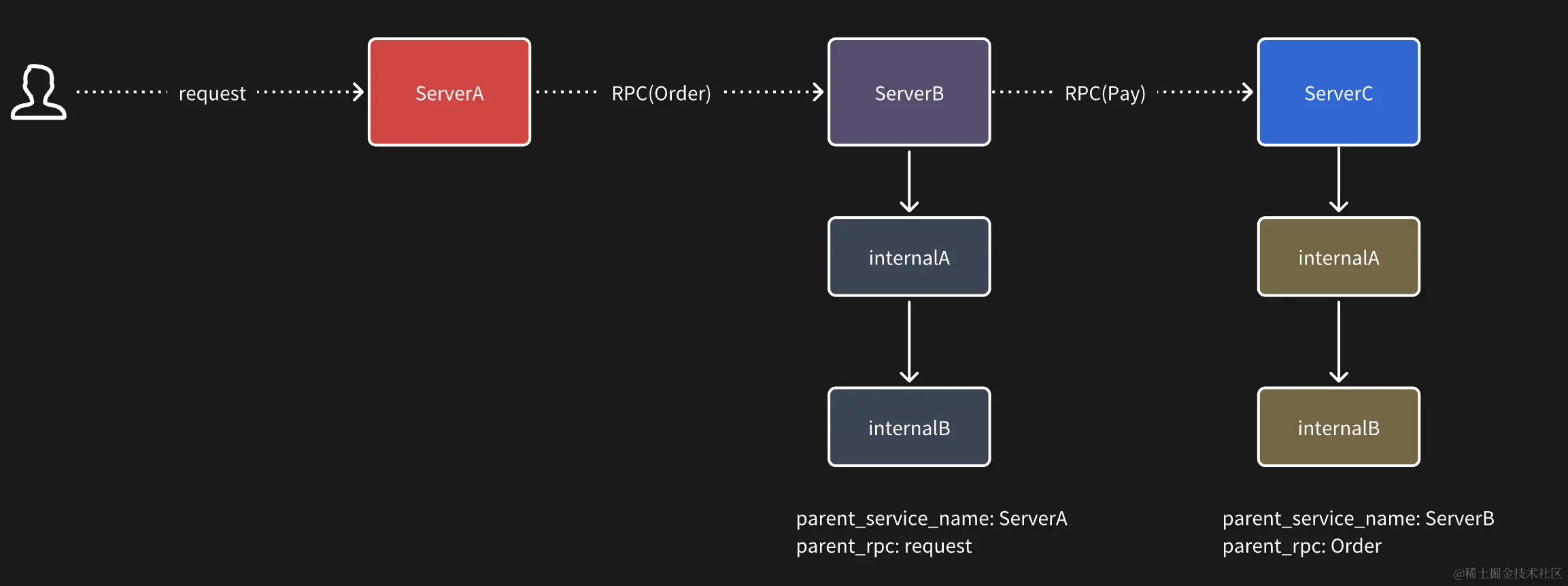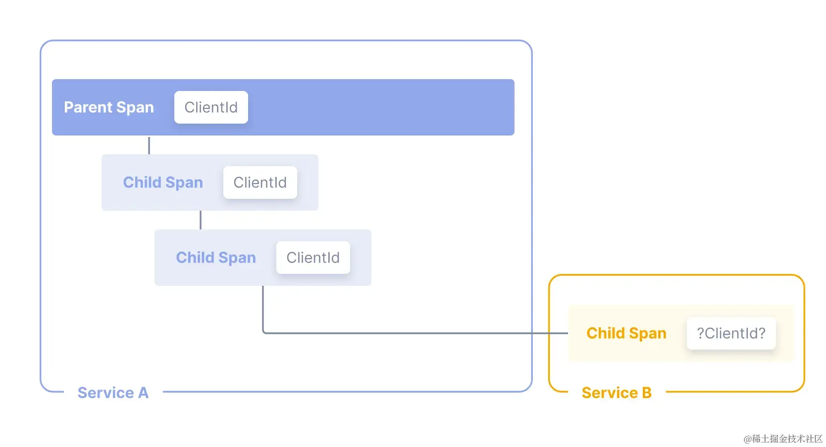 为此我们希望的效果是可以通过给每一个子 span 中加入两个 attribute,来标明它的父调用来源。