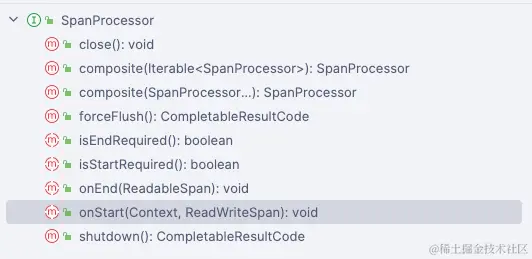 从注释中可以知道 SpanProcessor 是作为一个 span 的生命周期中的关键节点的 hook 函数。